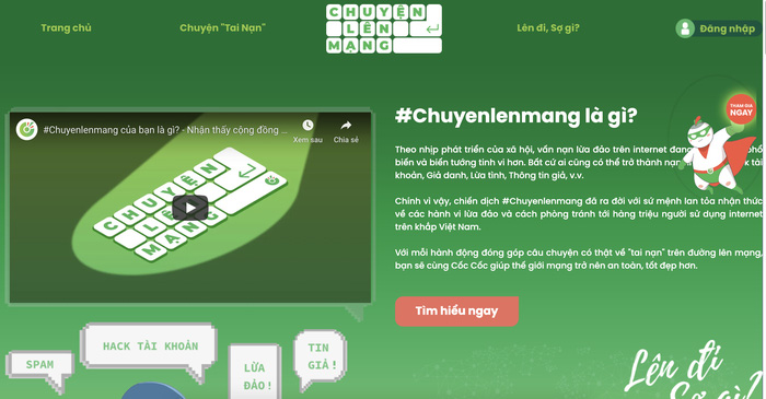Là trình duyệt nội địa phổ biến nhất tại Việt Nam với hơn 25 triệu người dùng, Cốc Cốc thực hiện chiến dịch “Chuyện Lên Mạng” với mong muốn lan tỏa nhận thức về vấn nạn lừa đảo và cách phòng tránh tới hàng chục triệu người sử dụng Internet trên khắp Việt Nam.