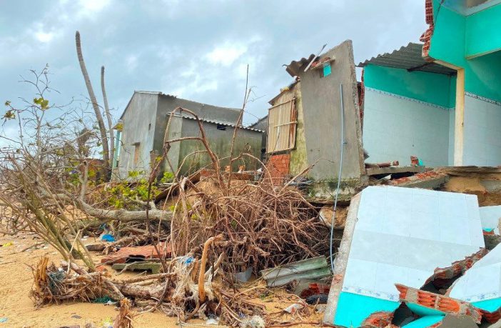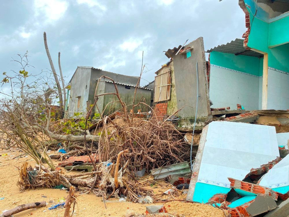 Triều cường liên tục “ngoạm” sâu vào bờ, quật sập nhà cửa của người dân thôn Phước Thiện, An Cường, xã Bình Hải, huyện Bình Sơn, |