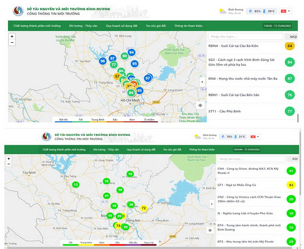 Giao diện Ứng dụng chia sẻ dữ liệu quan trắc môi trường của Sở TN&MT Bình Dương